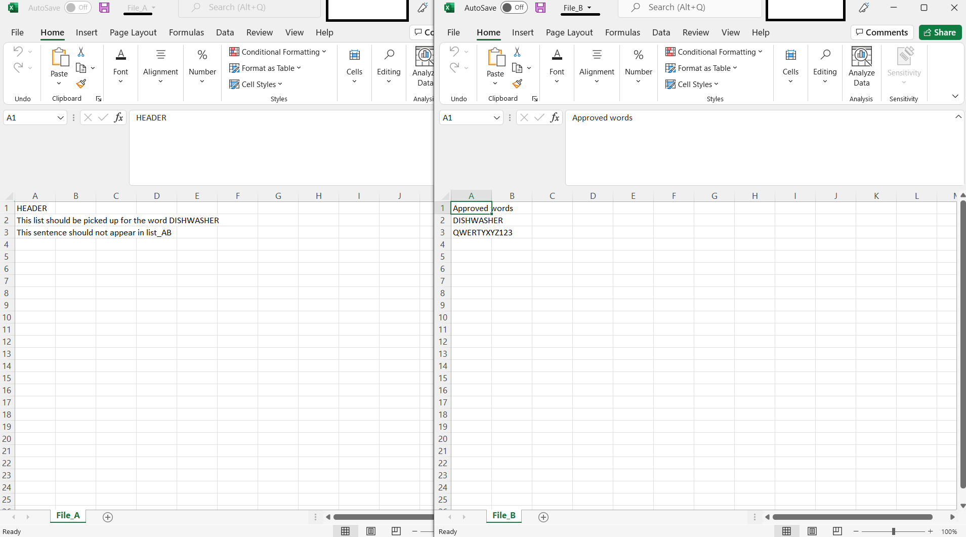 ##File A is 2 rows of sentences in 1 column, e.g. "This list should be picked up for the word DISHWASHER" and "This sentence should not appear in list_AB"