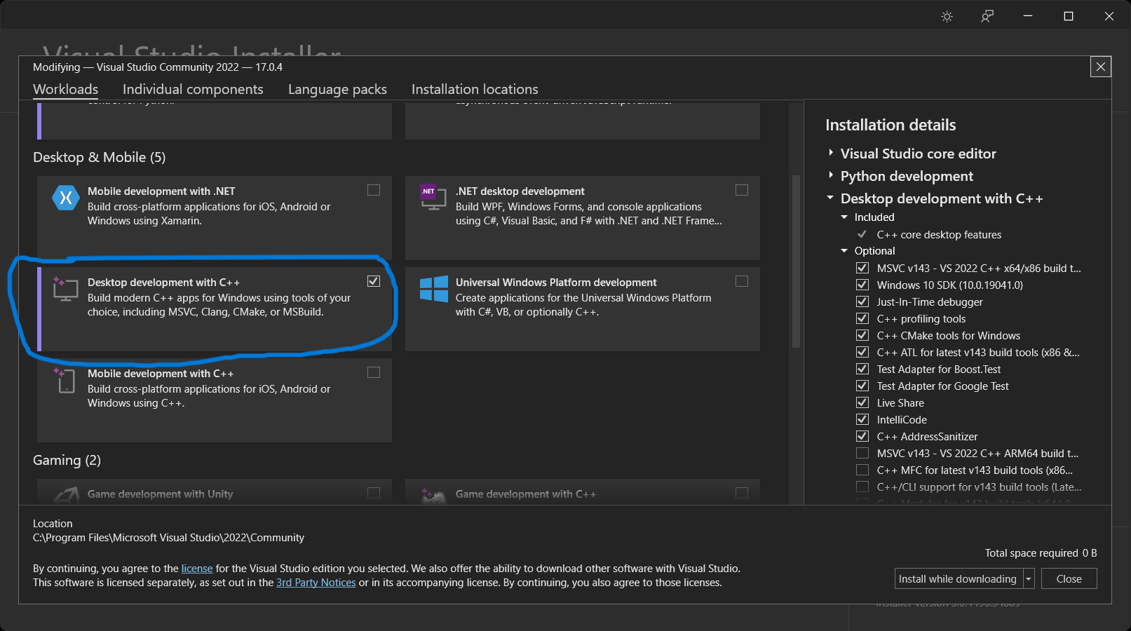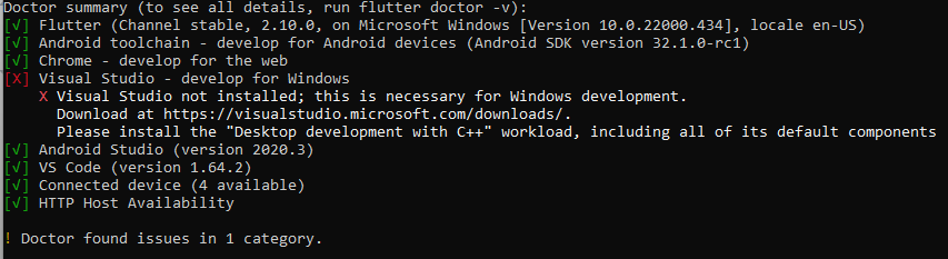 它基本上是说,如果您想为Windows开发您的颤振应用程序,您将需要安装VisualStudio2022,在安装VisualStudio2022时,您需要下载以下内容:用C++进行桌面开发