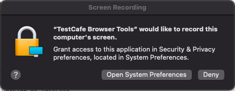 TestCafe requires permission to record the screen. Open 'System Preferences > Security & Privacy > Privacy > Screen Recording' and check 'TestCafe Browser Tools' in the application list.