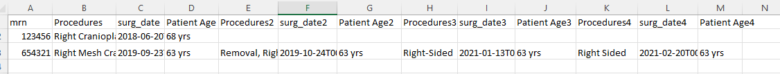 "654321", "654321"), Procedures = c("Right Cranioplasty With Custom Made Implant",