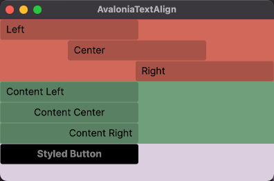 在布局可视化器区域右侧的Avalonia工具中显示的是HorizontalAlignment。但是,当按钮被选中时,您可以在文本形式的Properties区域的中间看到HorizontalContentAlignment。