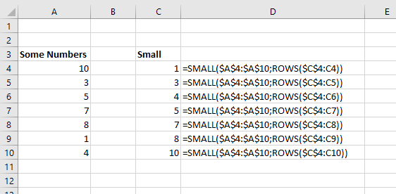 =SMALL($A$4:$A$10;ROWS($C$4:C4))