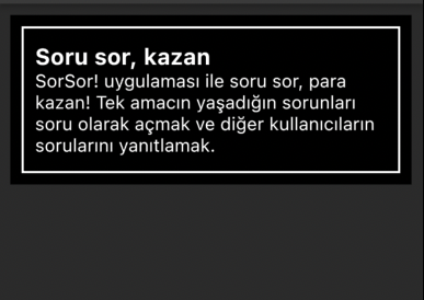 "SorSor! uygulaması ile soru sor, para kazan! Tek amacın yaşadığın sorunları soru olarak açmak ve diğer kullanıcıların sorularını yanıtlamak.",