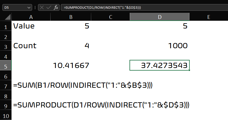 =SUMPRODUCT(D1/ROW(INDIRECT("1:"&$D$3)))