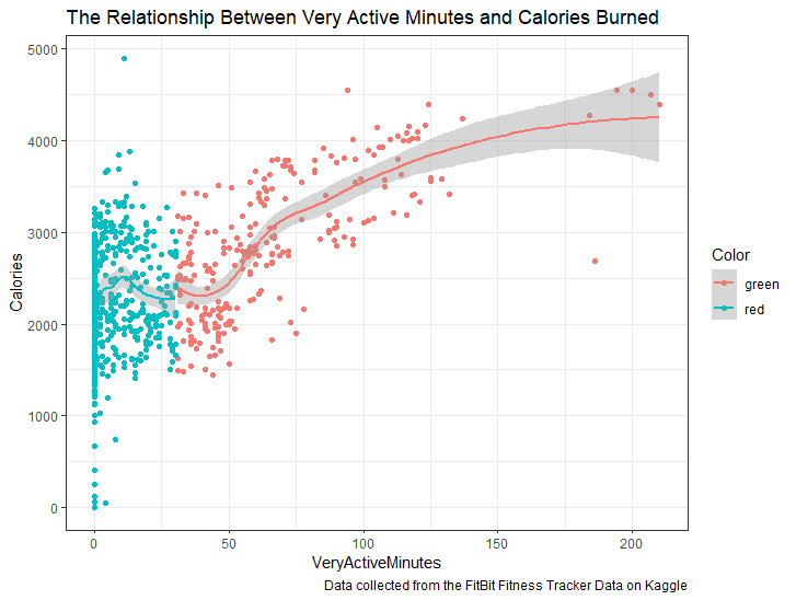 ggplot(aes(x=VeryActiveMinutes, y=Calories, color=Color)) +