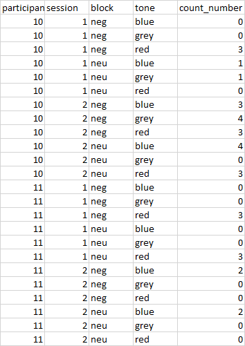 participant_id会话音count_number比10 1 neg蓝0 0 10 1 neg count_number 0 0 10 1 neg红3 0 10 1 neu蓝1#DIV/0 10 1 neu灰色1 #DIV/0!10 1 neu红0 #DIV/0!10 2 neg蓝3 2.333333333 10 2 neg灰色4 2.333333333 10 2 neg红3 2.333333333 10 2 neu蓝41.333333333 10 2 neu灰色0 1.333333333 10 2 neu红3 1.333333333 11 1 neg蓝0 0 11 1 neg灰色0 0 11 1 neg红3 0
