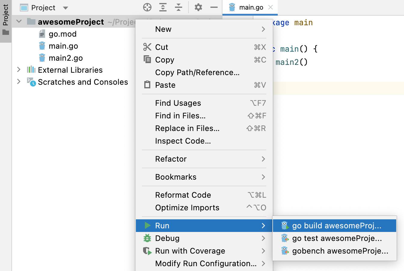 您可以通过单击Project中的目录名并选择Run > go build projectName来编译这些文件。或者选择Debug > go build projectName。