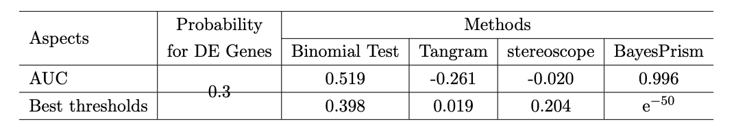 & for DE Genes & Binomial Test & Tangram & stereoscope & BayesPrism\\