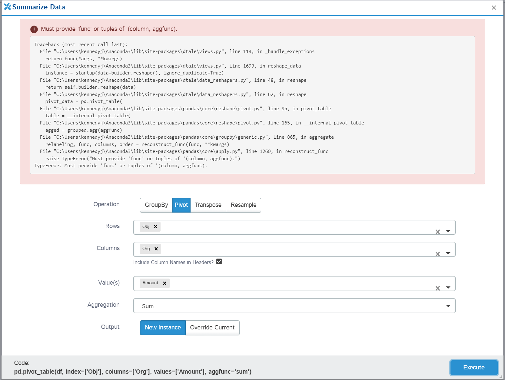 在Anaconda2.1.2下,使用dTale 2.1.0尝试分析一个简单的数据,并遇到明显的错误。以下是数据集: