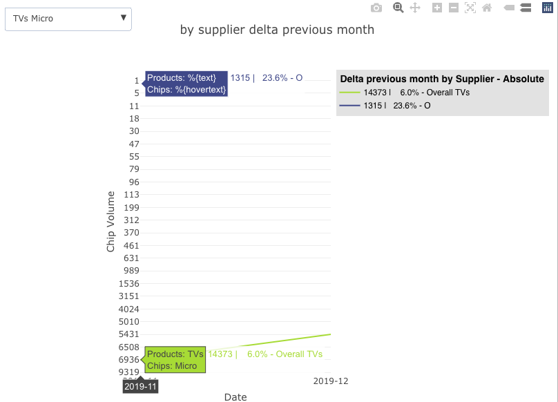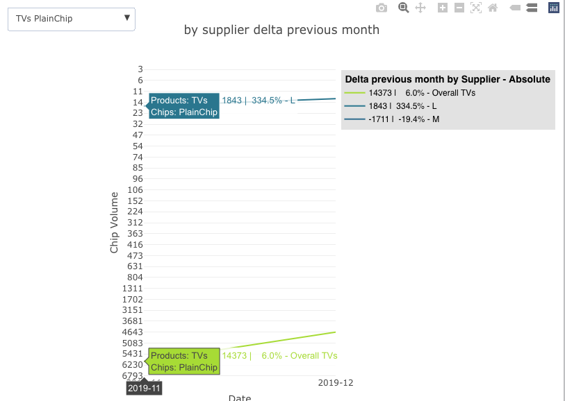 我试图使用R plot_ly来创建一个线条图,可以使用沿着“产品”和"Chip_type“过滤的筛选按钮来切换和关闭线条。其想法是,供应商(“供应商”/“Supplier_text”)每月为公司不同的产品部门(“产品”)提供不同种类的芯片("Chip_type")。为了了解顶级供应商的概况,我想在每个供应商中画一条线,在图例中显示"Supplier_text“,图例条目按照显示在"Supplier_text”前面的abs(数字)向下排序。在这方面,数据tibble被正确地排序。“总体”条目是指该产品的所有供应商的总和。