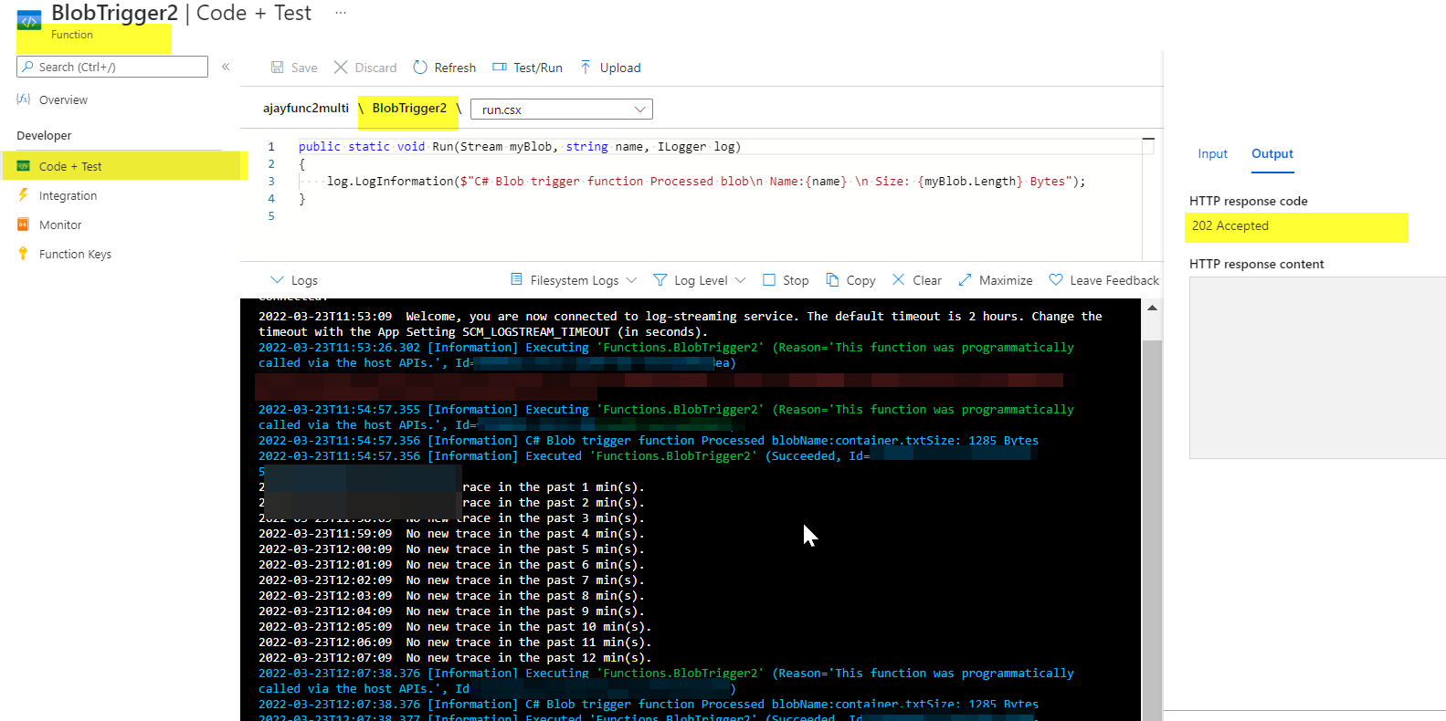 正如我们在最后尝试使用单个存储帐户(容器),并成功触发我们的两个功能应用程序。