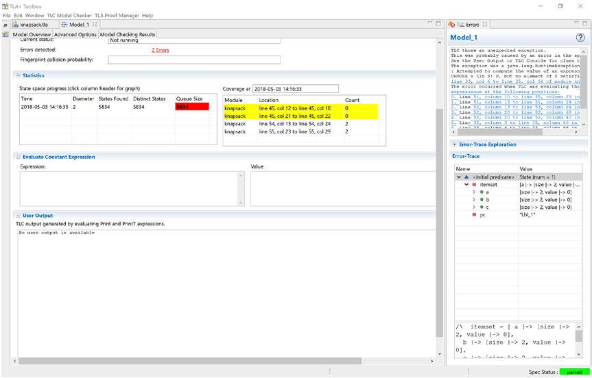 由于我们正在添加PlusCal规范,请记住删除“计算常量表达式”并设置“行为规范是什么?”“时间公式”当您运行这个程序时,您应该得到如图3-3所示的内容。