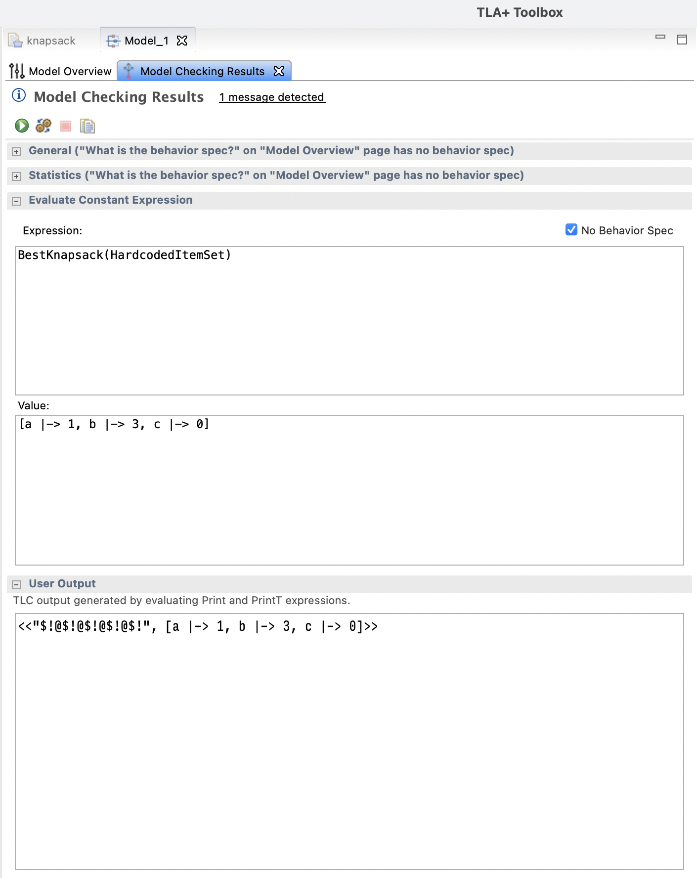 {sack \in [Items -> 0..4]: KnapsackSize(sack, itemset) <= Capacity}[Items -> 0..4]是从Item到大小0..4的所有可能映射的集合。最优的解决方案是适合于大小为Capacity的背包的子集,因此表达式KnapsackSize(sack, itemset) <= Capacity。