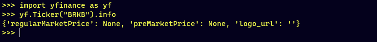 我正在使用Python中的yfinance获取不同日期的股票列表,但我注意到BRKB股票一直以“无”的形式出现。以前,我以为是我的代码出了问题,但当我在shell中尝试时,也发生了同样的错误。有没有人知道这是故意的,还是我做错了什么?