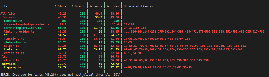 VSCode扩展单元测试使用遮罩下的摩卡咖啡。您可以使用许多可用的框架(例如c8、取笑、伊斯坦布尔等)生成覆盖报告,就像在任何其他类型记录/Javascript项目中一样。