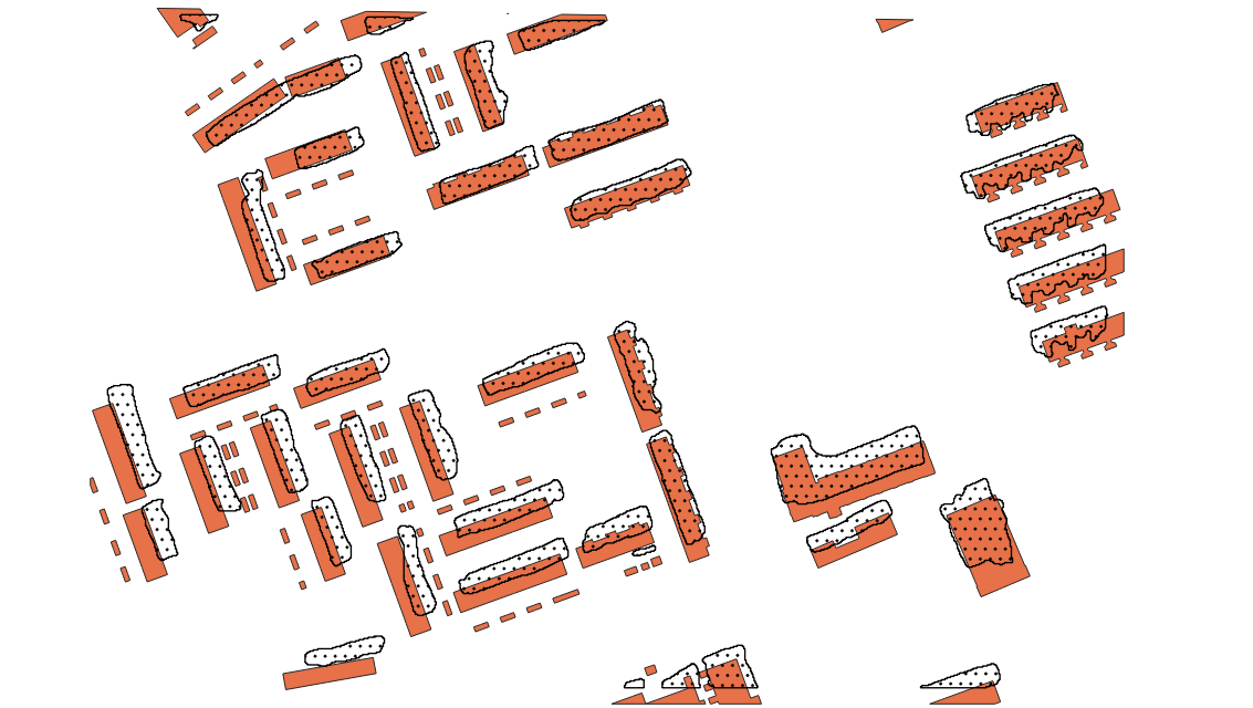 如果您不使用IOU分数作为损失函数,我建议将每个地图进行栅格化。创建一个2D像素地图(图像),其值为1,在任何地方--一个建筑物是预测的,而其他任何地方都是0。重复地面真相。通过对这些映射进行求和,或者首先按位和操作,然后对像素映射进行求和,您可以轻松地获得相交区域和单个区域。