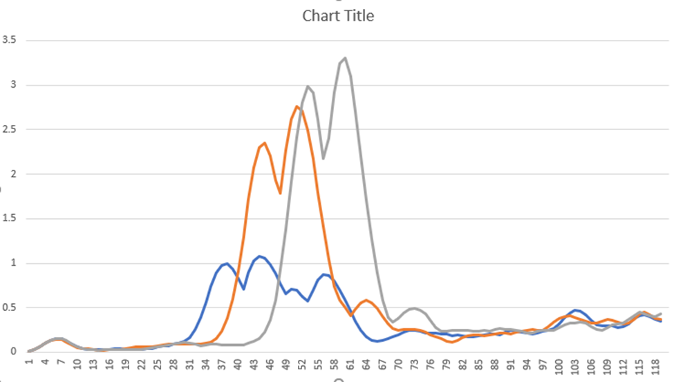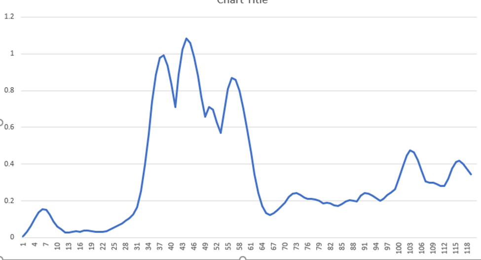 雷达被放在后面,所以目标离它很远。X轴表示距离乘以.077 m,因此,对于第一个蓝色波,雷达记录的距离为37*.077m。我想知道是否有一种方法可以从.csv文件中得到一个范围的值来考虑这两个峰值,例如:我想知道如何从蓝波中得到前两个峰值,得到它们的x轴坐标,然后为它们得到一个中值点,并跟踪它的橙色,这是第一列之下的第二行。