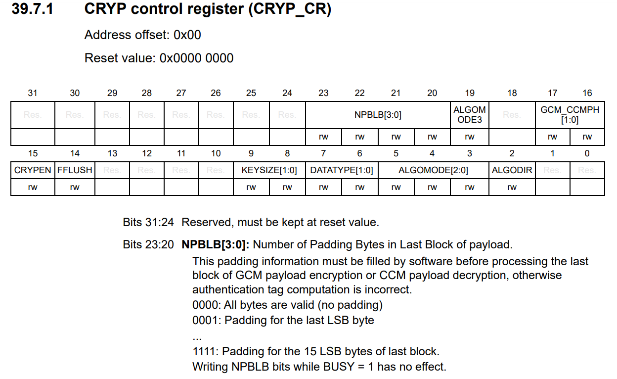 RevV支持GCM加密或CCM解密的硬件管理,其有效载荷大小小于128位。由于在CRYP_CR寄存器中添加了NPBLB位字段(图5中突出显示的单元格),这是可能的。
