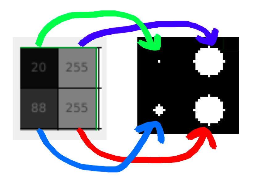 cv2.circle(arr_out, (col_idx * factor + factor_2, row_idx * factor + factor_2), int(8 * col / 255), 255, -1)
