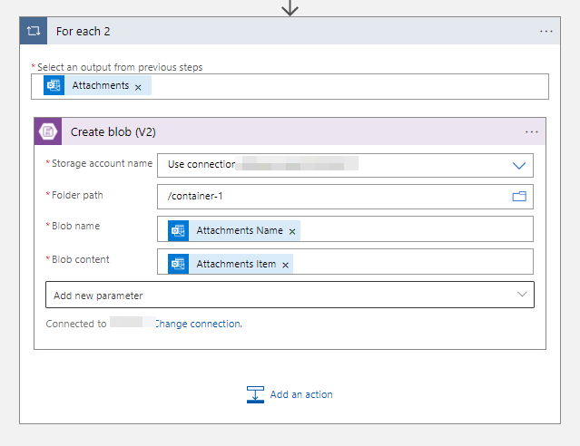 根据您的要求,您可以使用Create blob (V2)直接将outlook的excel文件附件保存到blob存储中。