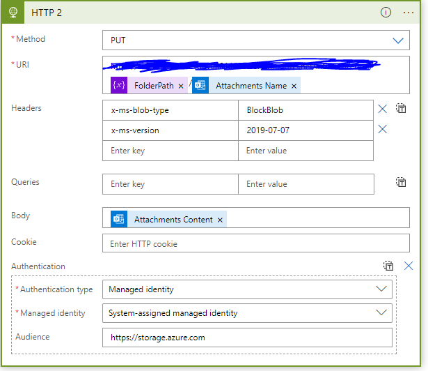 我正在使用Logic将excel文件从Outlook收件箱保存到Blob存储中。这是我正在使用的代码。