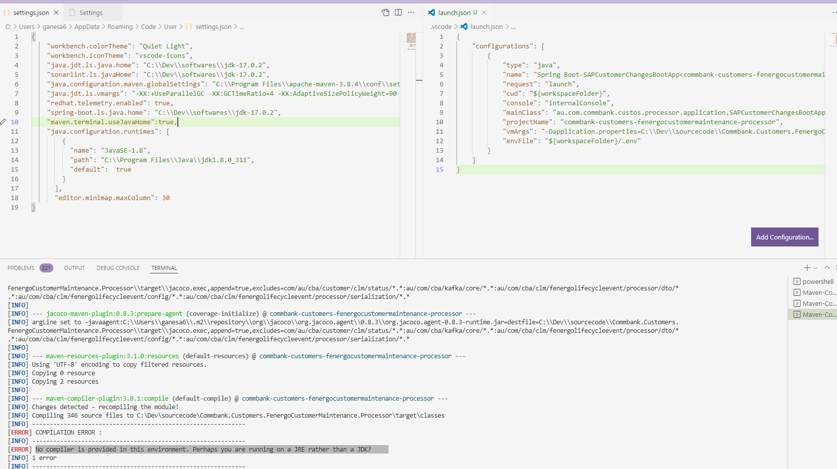 下面是vscode中的配置。虽然我已经在vscode中配置了JDK,但是当我运行maven安装时仍然会收到编译错误,但是maven测试工作正常。