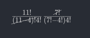 $\frac{11!}{\enclose{horizontalstrike}{(11-4)!}4!}\frac{\enclose{horizontalstrike}{7!}}{(7!-4!)4!}$