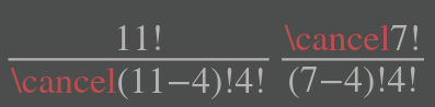 通过分母(11-4)!分子7!我试过用(11-4)!和~(11-4)!~ (11-4)~,它们各自工作,但在乳胶$\frac{11!}{(11-4)!4!}{7!}{(7-4)!4!}$中使用时,两者都不起作用。