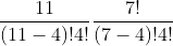 $\frac{11!}{\enclose{verticalstrike}{(11-4)!}4!}\frac{\enclose{verticalstrike}{7!}}{(7!-4!)4!}$
