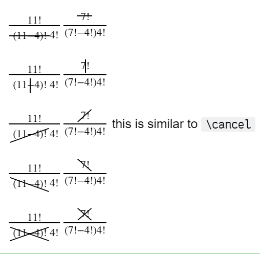 $\frac{11!}{\enclose{updiagonalstrike}{(11-4)!}4!}\frac{\enclose{updiagonalstrike}{7!}}{(7!-4!)4!}$ this is similar to `\cancel`