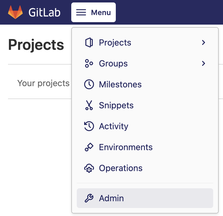 管理菜单仅限于GitLab管理员。如果您没有看到Admin按钮,这很可能意味着您不是GitLab管理员。如果您正在使用gitlab.com,几乎所有的gitlab.com用户都是这样的。