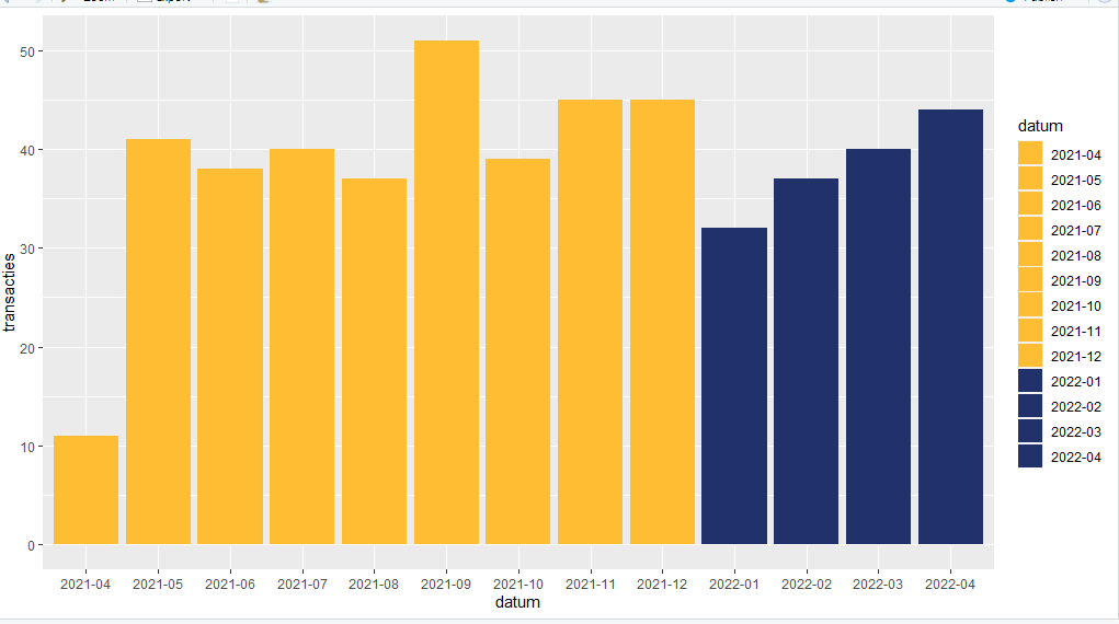 ggplot(dataset3, aes(x= datum, y = transacties, fill = datum)) +