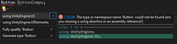 using UnityEngine.UI;Button来自UnityEngine.UI命名空间。
