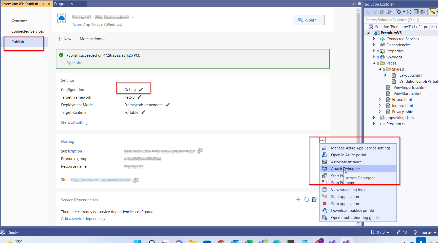 Azure PremiumV2应用服务计划失去了在标准应用服务计划之上附加远程调试器的能力: