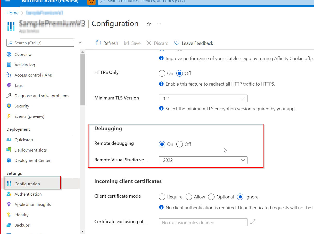 远程调试:当您将应用程序扩展到PremiumV2时,您将不再能够为应用程序使用远程调试。如果将应用程序服务计划扩展到较低层,则可以再次使用远程调试。