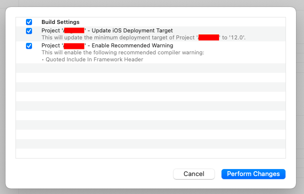 Xcode当前显示一个黄色警告标志Update to recommended settings。
