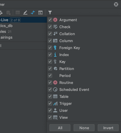 DataGrip UI有两个地方可以过滤可见表列表,并且这些筛选器是复合的。首先是旁边的主过滤器: