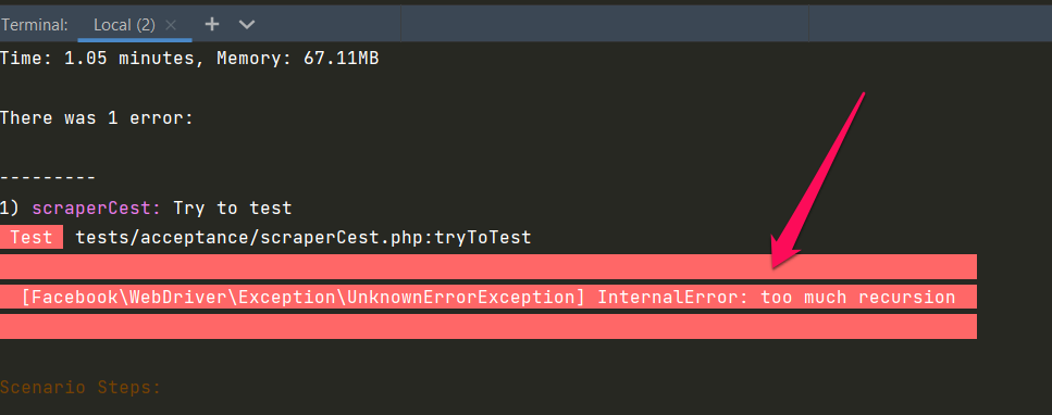 当试图对特定的文本执行$i->参阅()时,[Facebook\WebDriver\Exception\UnknownErrorException] InternalError: too much recursion测试将失败。