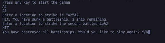 "You have destroyed all battleships. Would you like to play again? Y/N"
