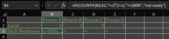 =IF(COUNTIF(B2:E2,">=2")>=2,">=100%","not ready")