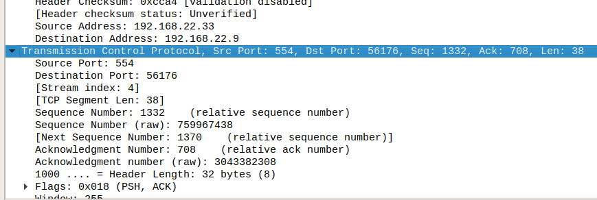 RTSP客户端进行连接和设置,并正确播放(视频可以在客户端看到)。我担心的是,RTP (视频和音频)是通过TCP (通过端口554)发送的。是的,我知道它的正确行为,但我很迷惑它使用与RTSP (端口554)相同的端口。我一直认为RTSP将有一个静态端口号,在RTSP连接建立之后,客户端将与服务器协商RTP/RTCP连接(这将导致创建额外的端口(在我的例子中为4)。然而,似乎所有的RTP/RTSP/RTCP流量都是通过同一个端口进行隧道化的(或者我误解了结果)。