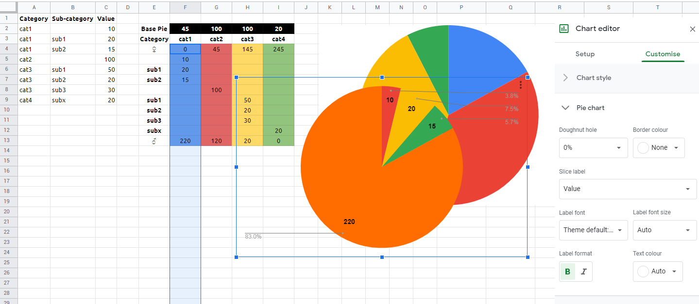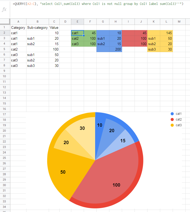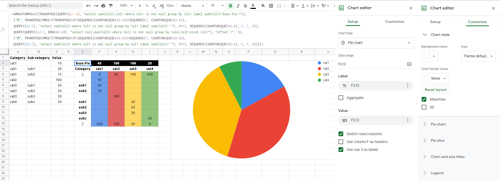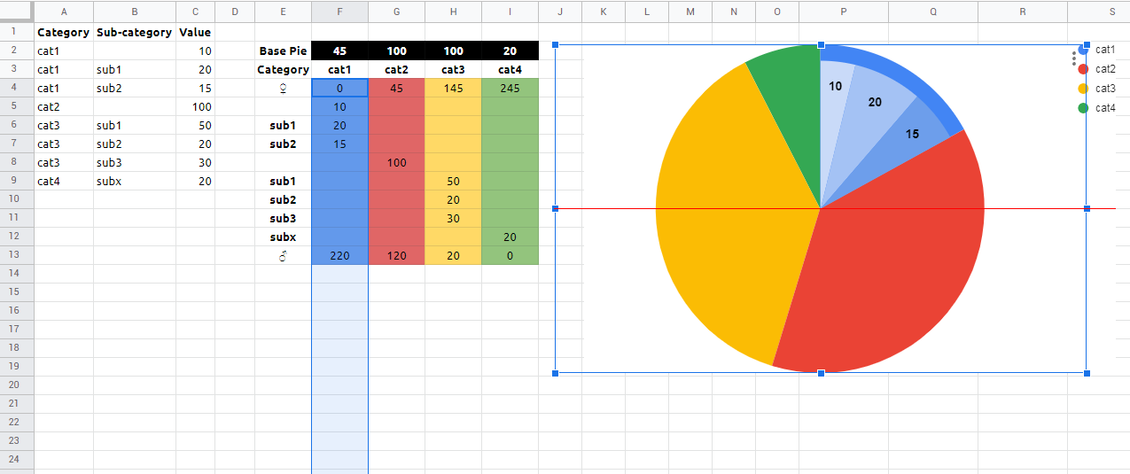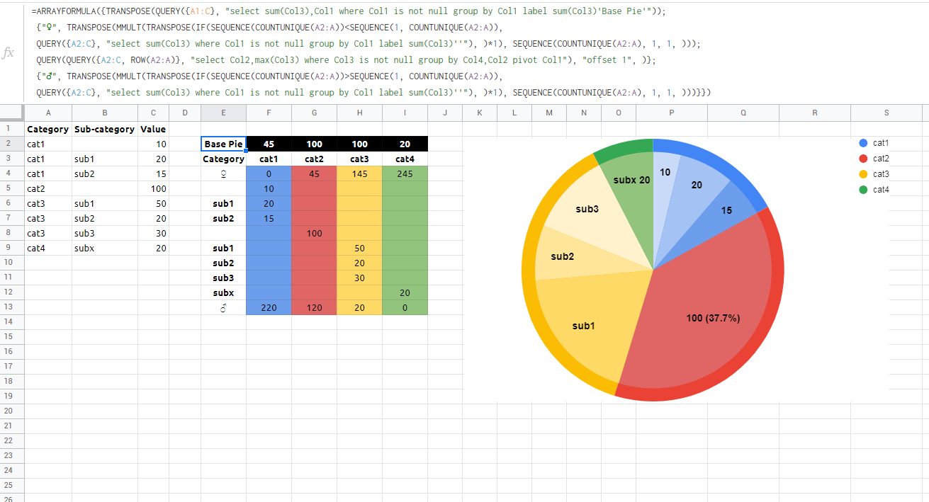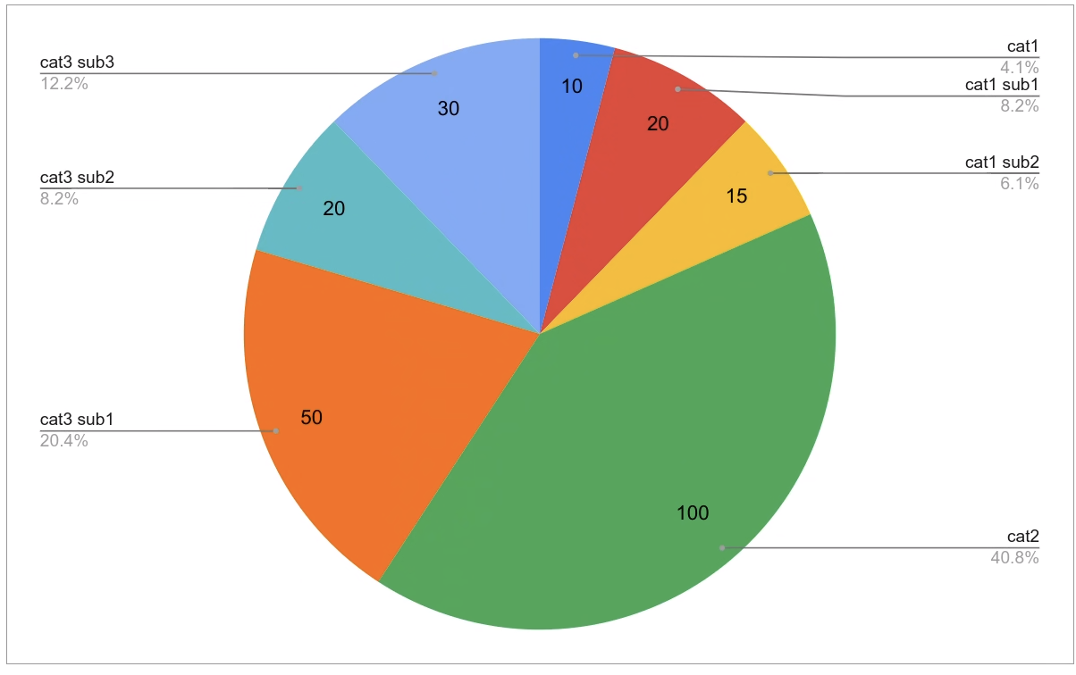 我需要一个多级嵌套饼图在谷歌页。在类别和子类别中显示数字和。可以使用代码或公式。