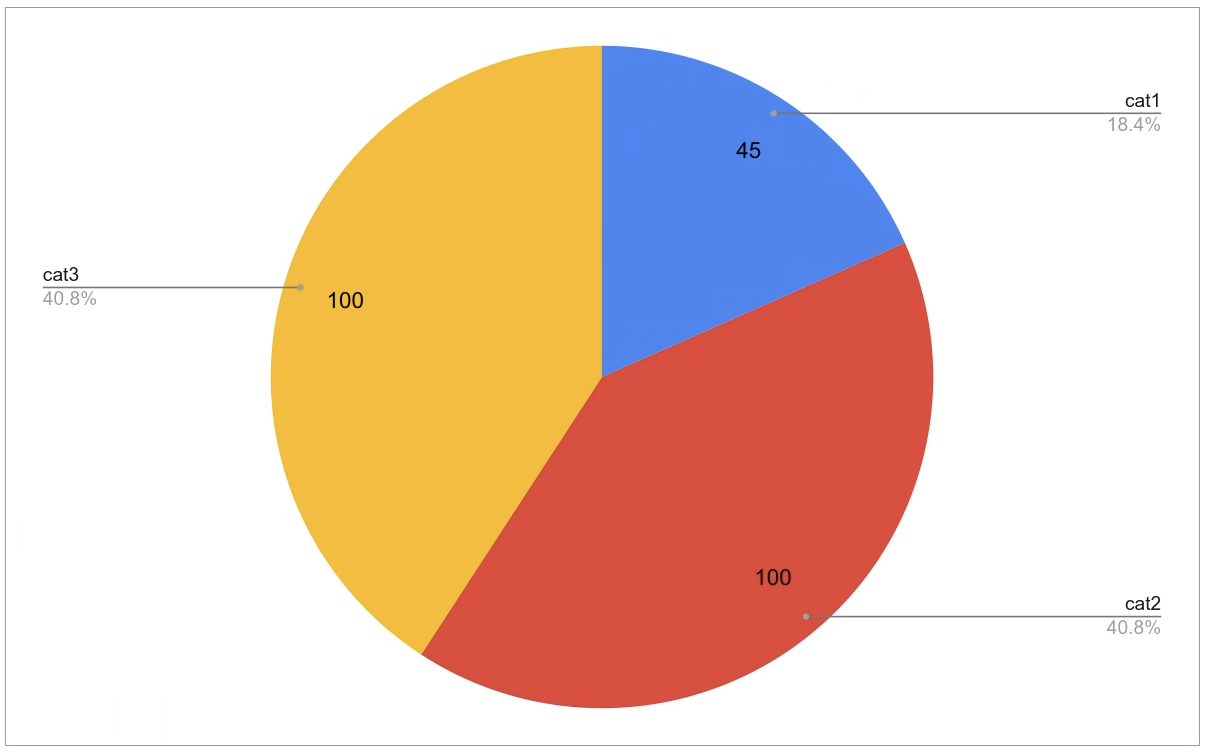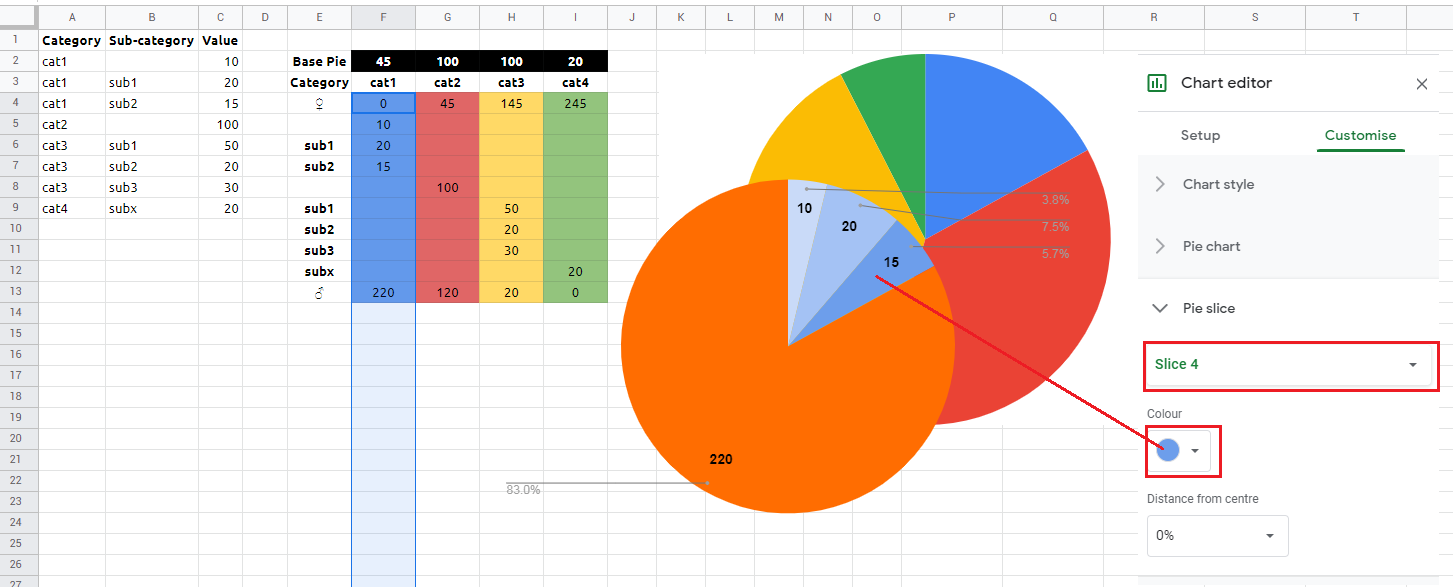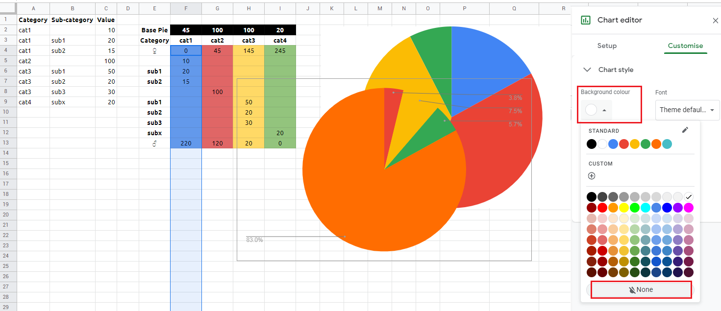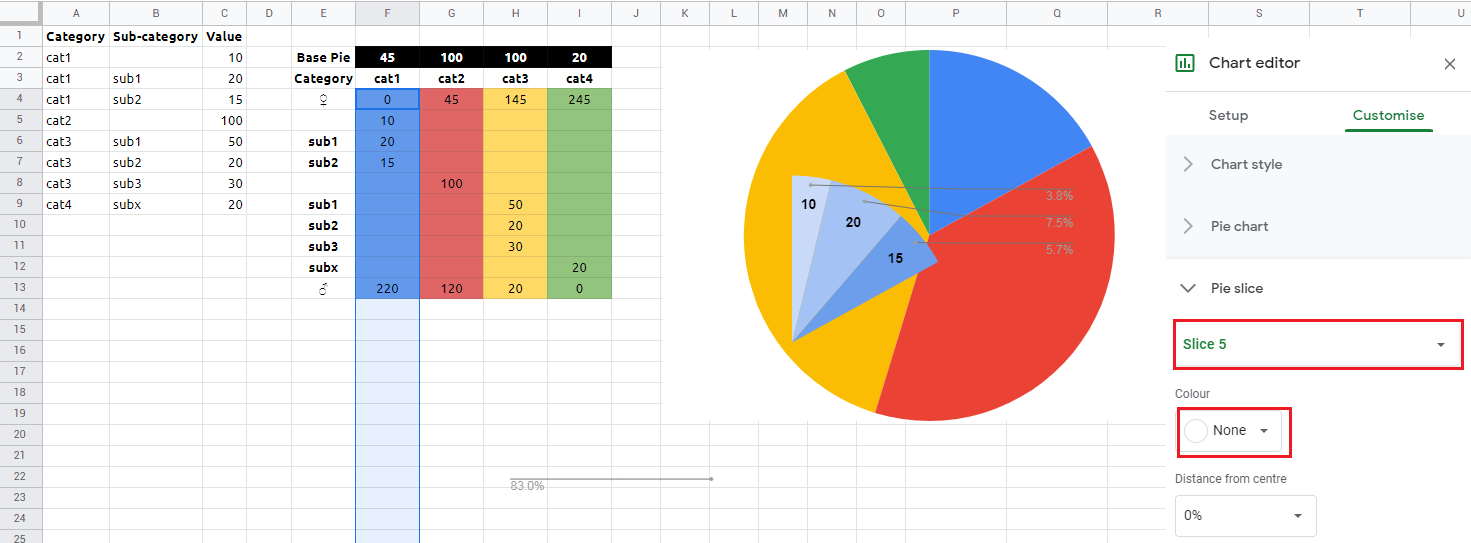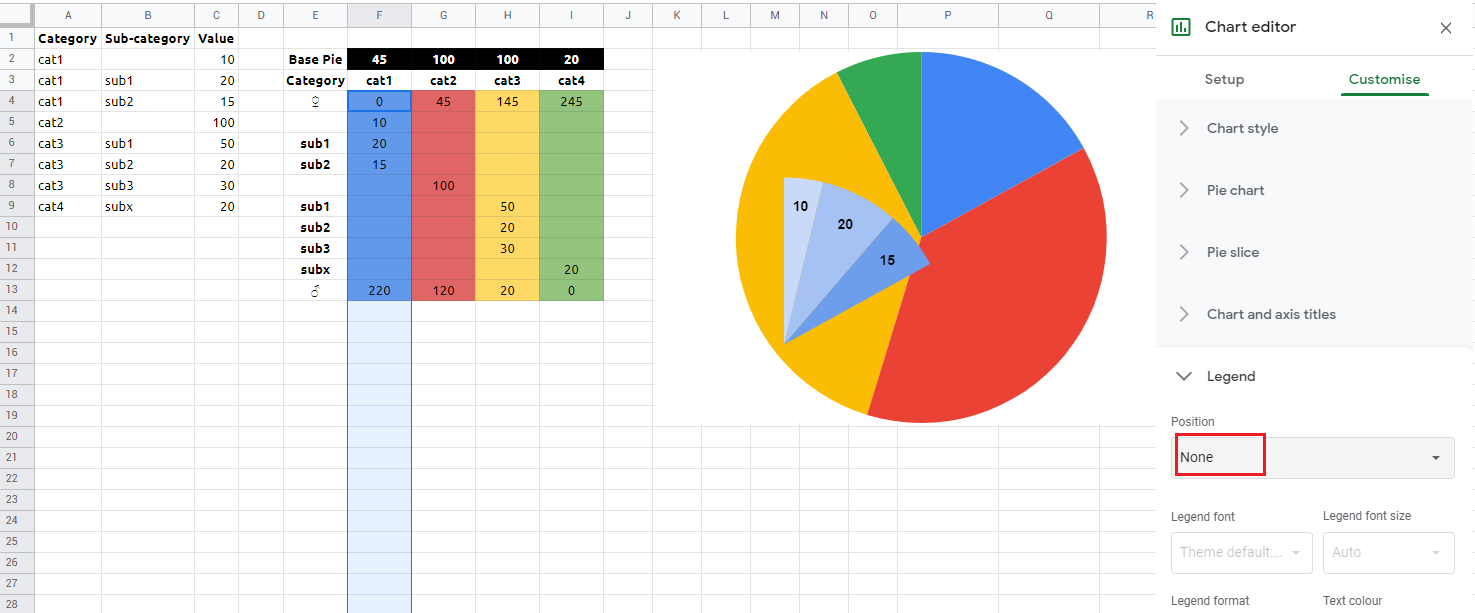 我需要一个多级嵌套饼图在谷歌页。在类别和子类别中显示数字和。可以使用代码或公式。