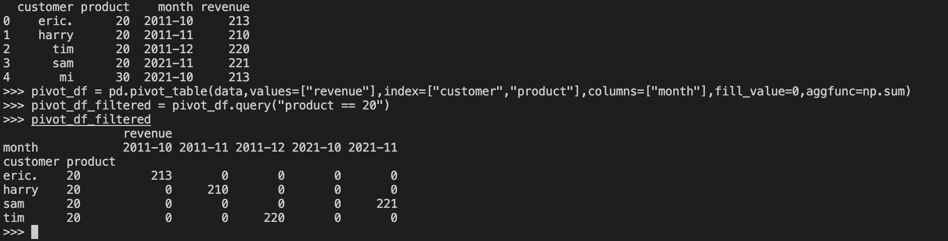 pivot_df = pd.pivot_table(data,values=["revenue"],index=["customer","product"],columns=["month"],fill_value=0,aggfunc=np.sum)