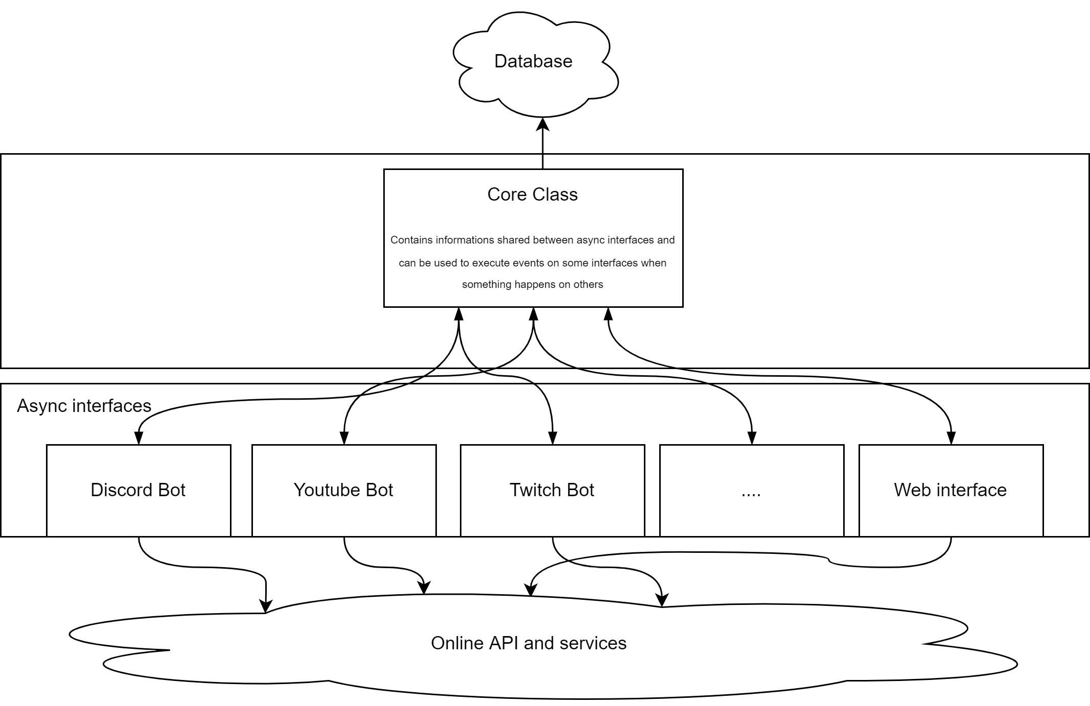 首先,实例化一个Core类,这个类将包含所有机器人和接口的实例,并存储它们之间共享的变量。它还包含数据库的全局异步锁(因为整个bot运行在一个异步循环上,我需要确保只有一个接口同时与数据库对话)。