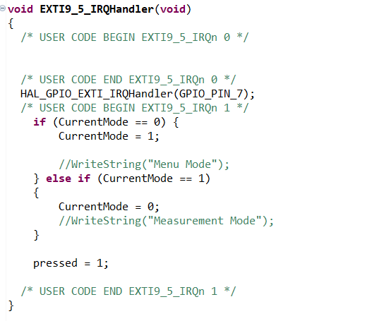 在CubeMX中启用GPIO中断时,代码生成器将在适当的IRQ处理函数中添加一行。启用多个中断时,生成的代码如下所示(注释已删除):