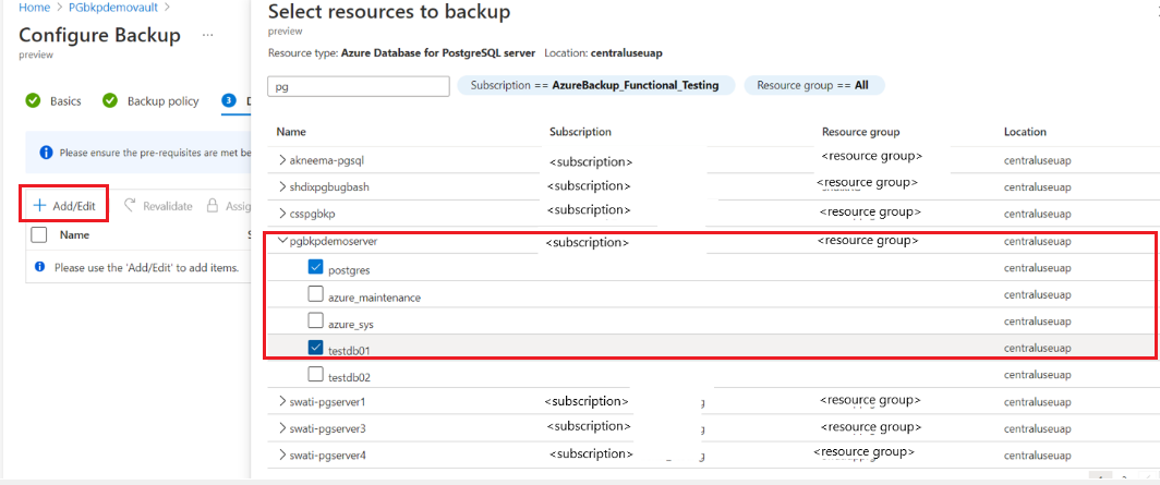 我创建了Vault,一个资源小组。但是,当我试图使用Vault和backup策略配置备份时,它无法在资源中看到PostgreSQL数据库服务器。