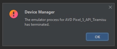 2022-05-16 10:24:52,588 [ 367217] ERROR - Emulator: Pixel 5 API Tiramisu - Emulator terminated with exit code 1