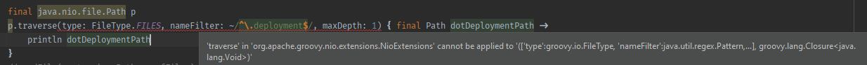 Script4.groovy: 59: [Static type checking] - Cannot call java.nio.file.Path#traverse(java.util.Map <java.lang.String, java.lang.Object>, groovy.lang.Closure) with arguments [java.util.LinkedHashMap <java.lang.String, java.io.Serializable>, groovy.lang.Closure]