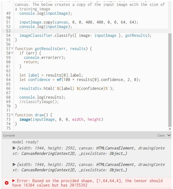 我训练了一个用ml5.js编写的图像分类神经网络模型。当我尝试在p5.js web编辑器中使用模型文件时,我会得到一个错误“基于提供的形状,1,64,64,4,4,张量应该有16384个值,但有20155392‘。